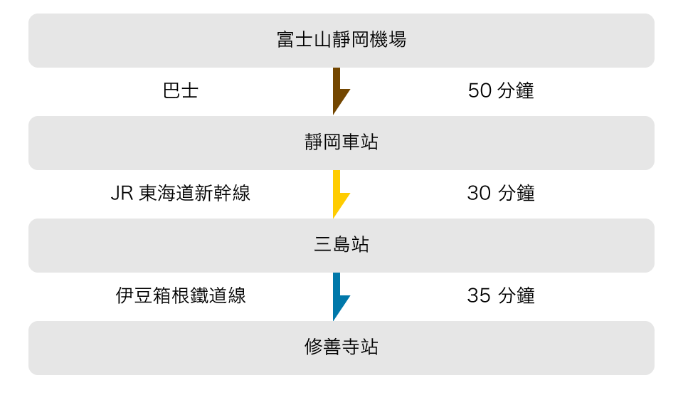 从伊豆箱根铁道修善寺站乘坐巴士或出租车约需25分钟。巴士班次较少。优惠高级出租车往返套餐信息请点击此处。咨询修善寺站内观光问讯处,旅行更加方便(英文、韩文应对)。